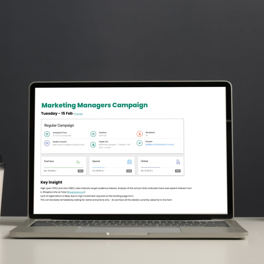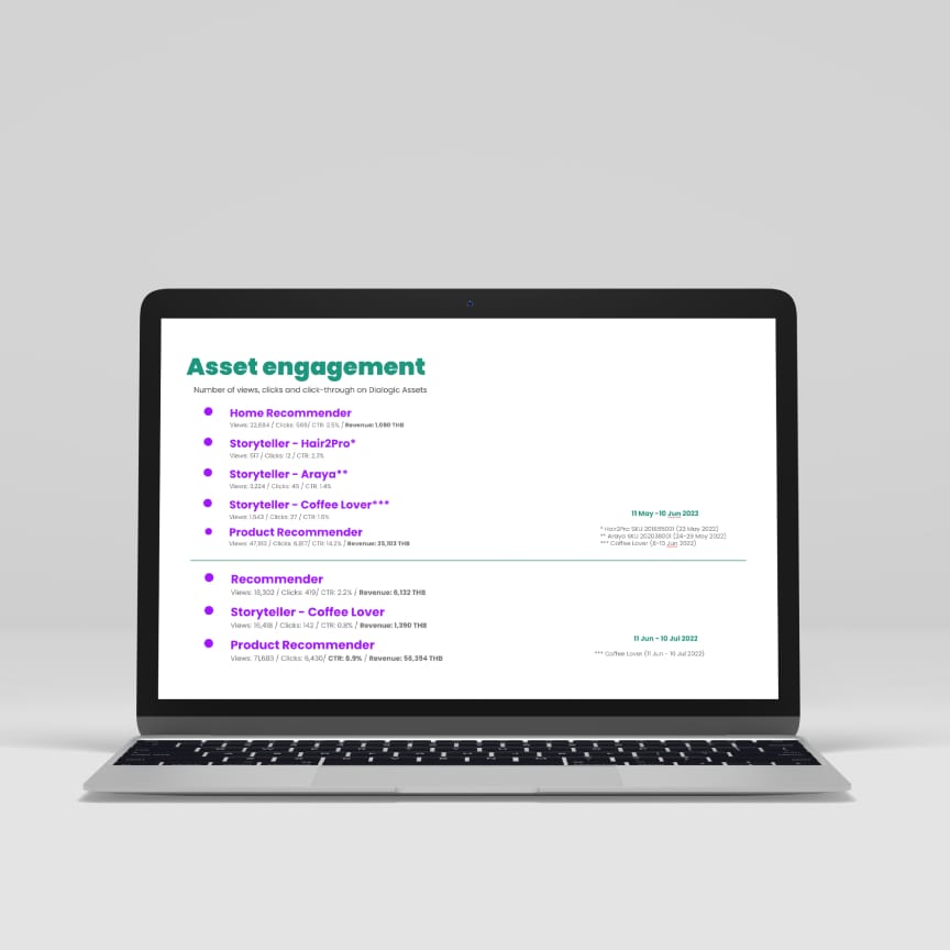 The brand package listed above requires a monthly investment of ~฿30k. The minimal pilot period is 3 months – This gives us 2 months to learn your industry, and 1 month to implement our insights into your campaigns.