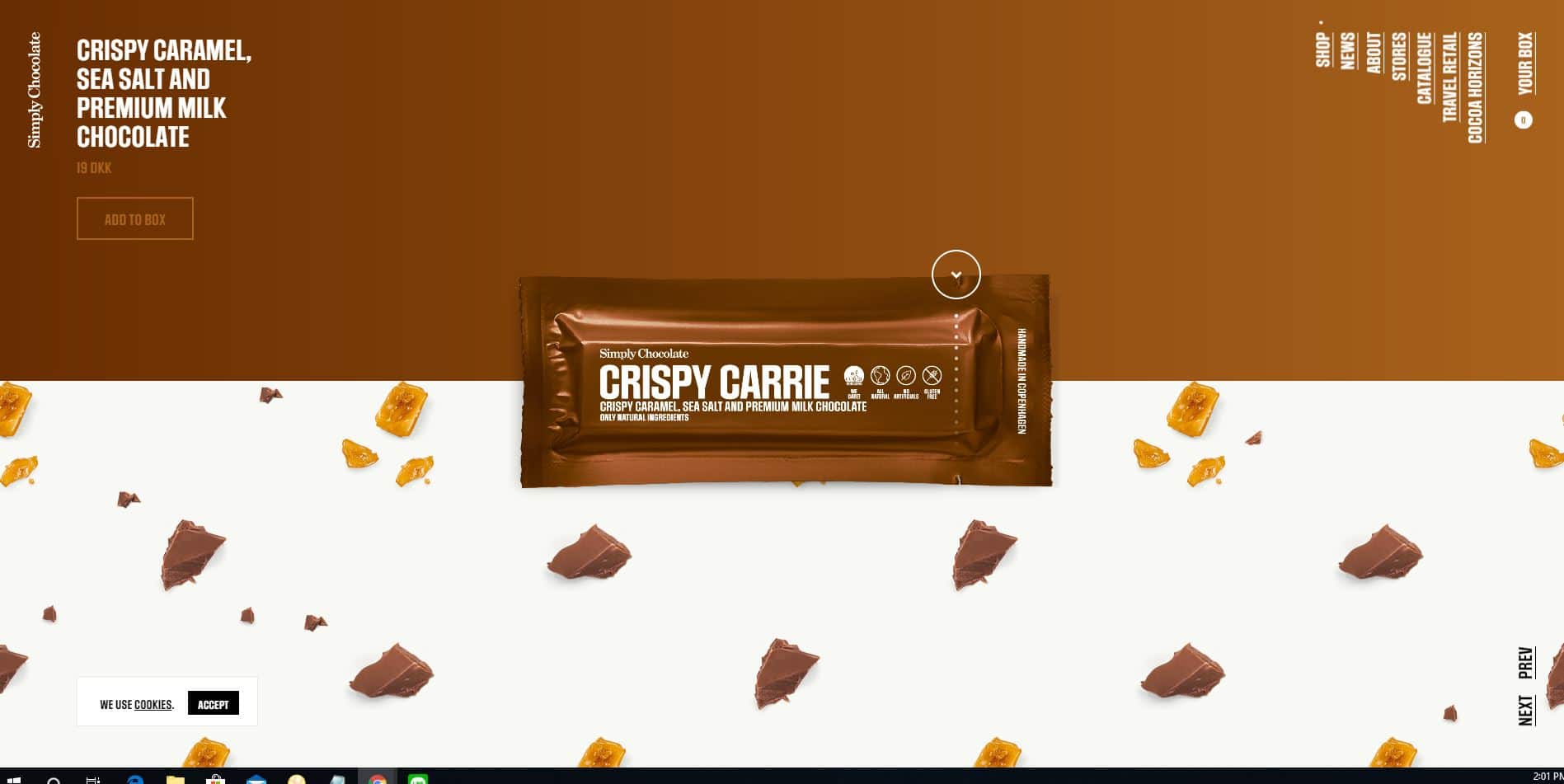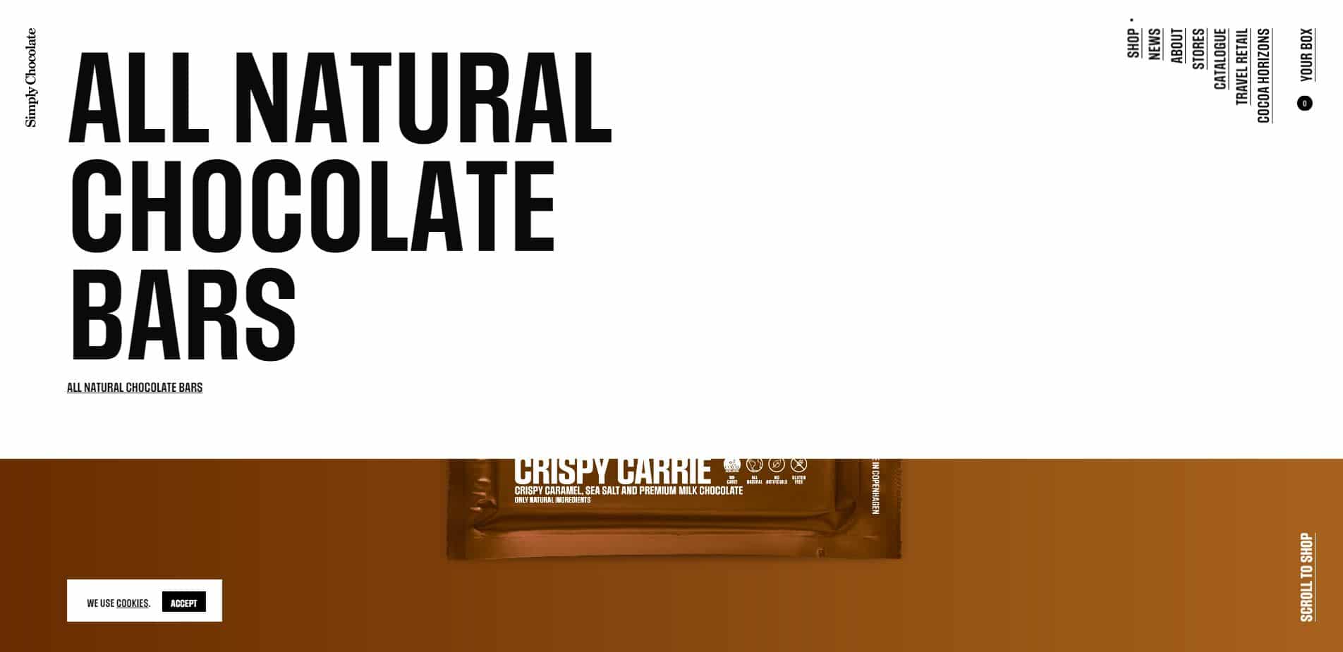 The easiest way to create a sense of visual hierarchy is by controlling sizing and scale of visual elements. BIG items will draw our attention first, and we’ll then use them as a scaling reference for the importance of everything else we see. For example, on the homepage of Simply Chocolate, our eyes are immediately drawn to the most essential keywords: All Natural Chocolate Bars. And, as we scroll down, we see each chocolate flavor one by one. This is a really good example of website/UI/UX design: aesthetically pleasing yet simple and straightforward.